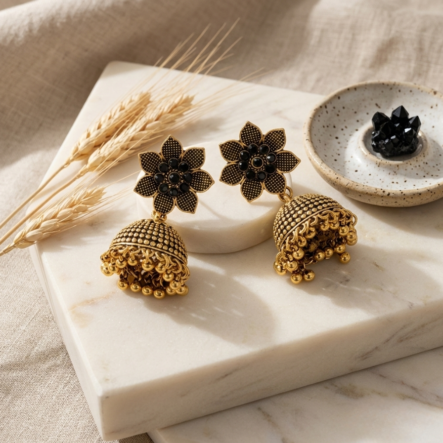 A Pair of Vintage Jhumka Casual Earrings Adorned with Rhinestone Flower Designs And Round Bead Tassels, Perfect for Women to Wear on a Daily Basis, During Festivals, Weddings, And Parties, Or As Jewelry Gifts.